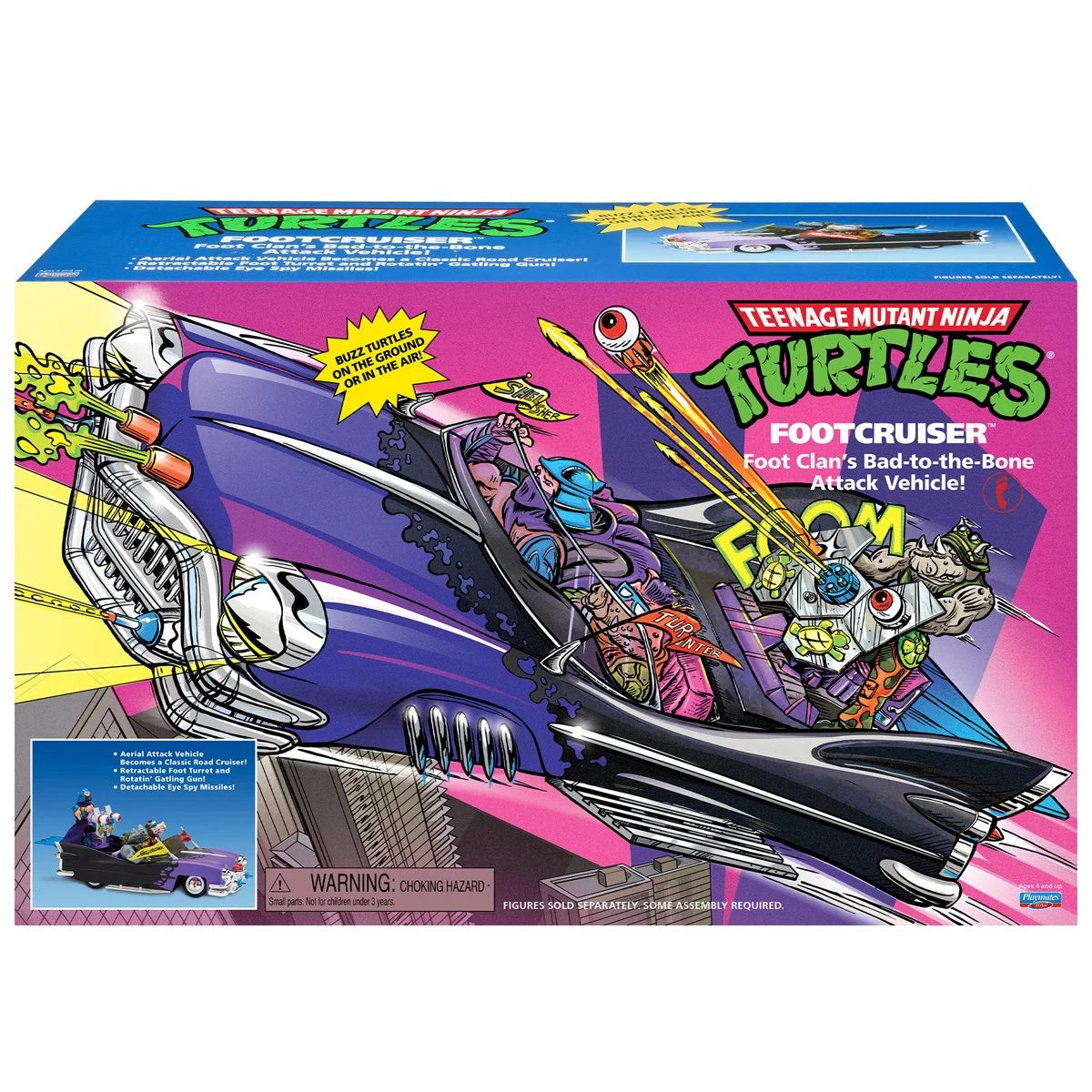 Street Or Sky - It's one mean street cruiser but cruisin' for Turtle-bruisin is only part of the fun! Retract the Footcruiser's wheels and the classic ground hugger transforms. Now it's an awesome space-cruisin' atttack ship with shell-scratchin' skirtsFire Power: The Foot turret is outfitted with a rotatin' gatling gun and detachable eye spy missiles, to blow those pesky teen Turtles to kingdom comeAuthentic designs: Footcruiser comes in a highly detailed closed box with original illustrations, inspired by the original 1989 Footcruiser packageSet includes original 1989 sticker designs to decorate the Foot Clan's attack vehicle